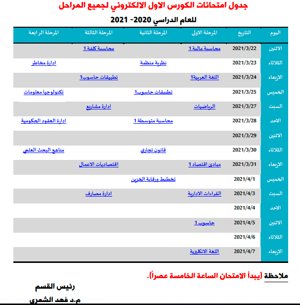 جدول امتحانات نهاية الكورس الاول للعام الدراسي 2020-2021