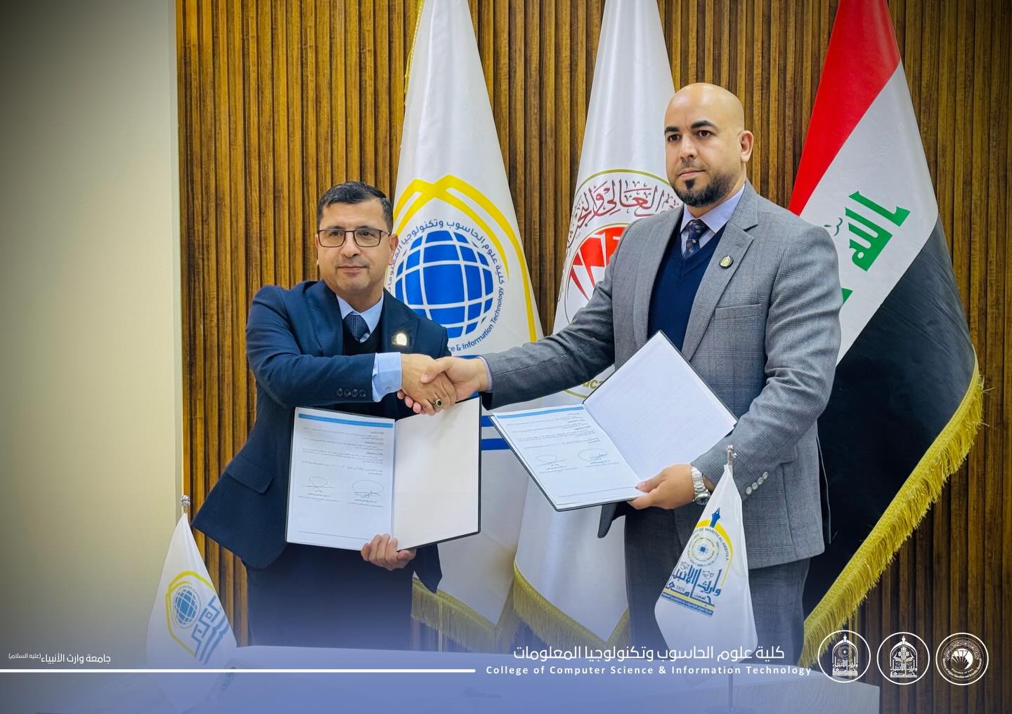 توقيع اتفاقية توأمة علمية بين كلية علوم الحاسوب وتكنولوجيا المعلومات في جامعة وارث الانبياء عليه السلام وجامعة كربلاء لتعزيز التعاون الأكاديمي.