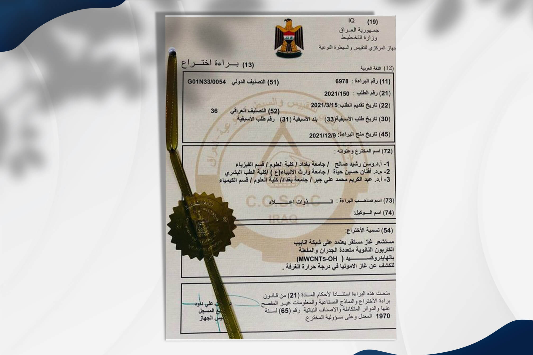 حصلت المدرس الدكتورة(افنان حسين حياة )التدريسية في كلية الطب البشري في جامعة وارث الانبياء(عليه السلام) على براءة اختراع لمستشعر غاز الامونيا (NH3)