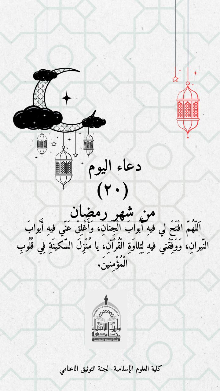 اَللّهُمَّ افْتَحْ لي فيهِ أَبْوابَ الْجِنانِ، وَأَغْلِقْ عَنّي فيهِ أَبْوابَ النّيرانِ، وَوَفِّقْني فيهِ لِتِلاوَةِ الْقُرْآنِ، يا مُنْزِلَ السَّكينَةِ فِي قُلُوبِ الْمُؤْمِنينَ.