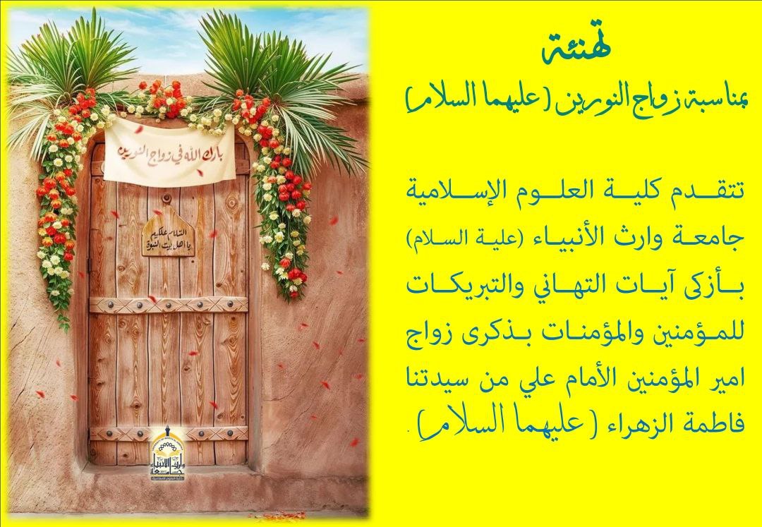 تتقدم كلية العلوم الإسلامية جامعة وارث الأنبياء (عليه السلام) بأزكى آيات التهاني والتبريكات للمؤمنين والمؤمنات بذكرى زواج امير المؤمنين الأمام علي من سيدتنا فاطمة الزهراء ( عليهما السلام)
