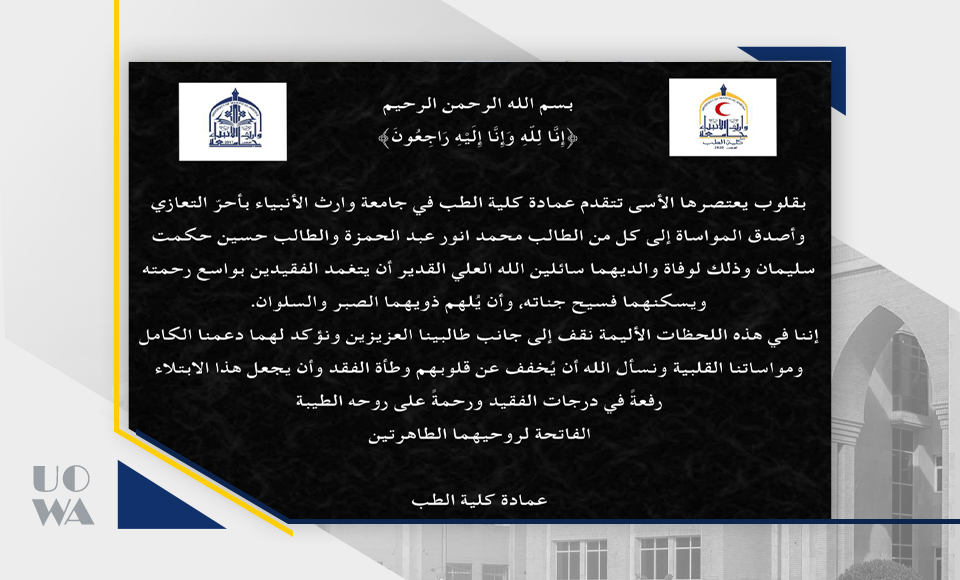 اختتم قسم النشاطات الطلابية في جامعة وارث الانبياء(عليه السلام) بطولة تشرين الكروية الخاصة بالأساتذة والموظفين، حيث كانت انطلاقة المباراة النهائية بقراءة سورة الفاتحة ترحماً على ارواح الشهداء الذين سقطوا في ساحات التظاهر السلمية، وجرت المباراة النهائية بين فريق كلية العلوم الاسلامية وفريق بناية العُلى (الرئاسة) والتي انتهت بفوز فريق العلوم الاسلامية بركلات الترجيح، يذكر ان هذه البطولة الرياضية التي اقامها قسم النشاطات الطلابية في الجامعة كانت بالتعاون مع مركز رعاية الشباب التابع للعتبة الحسينية المقدسة.