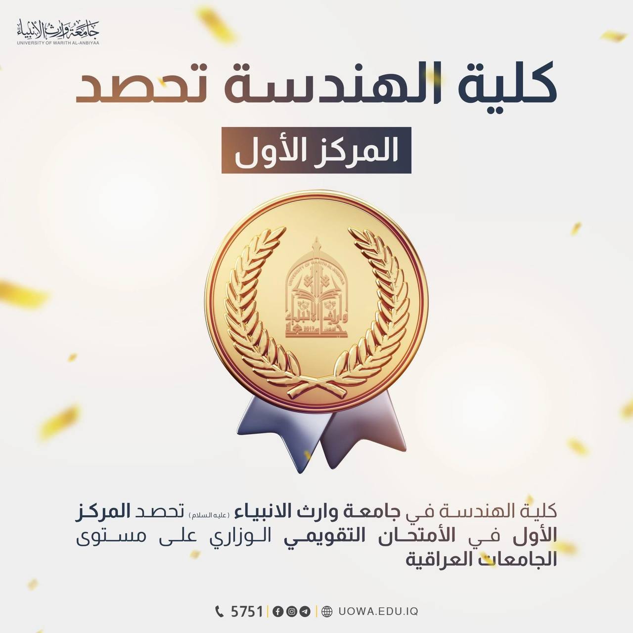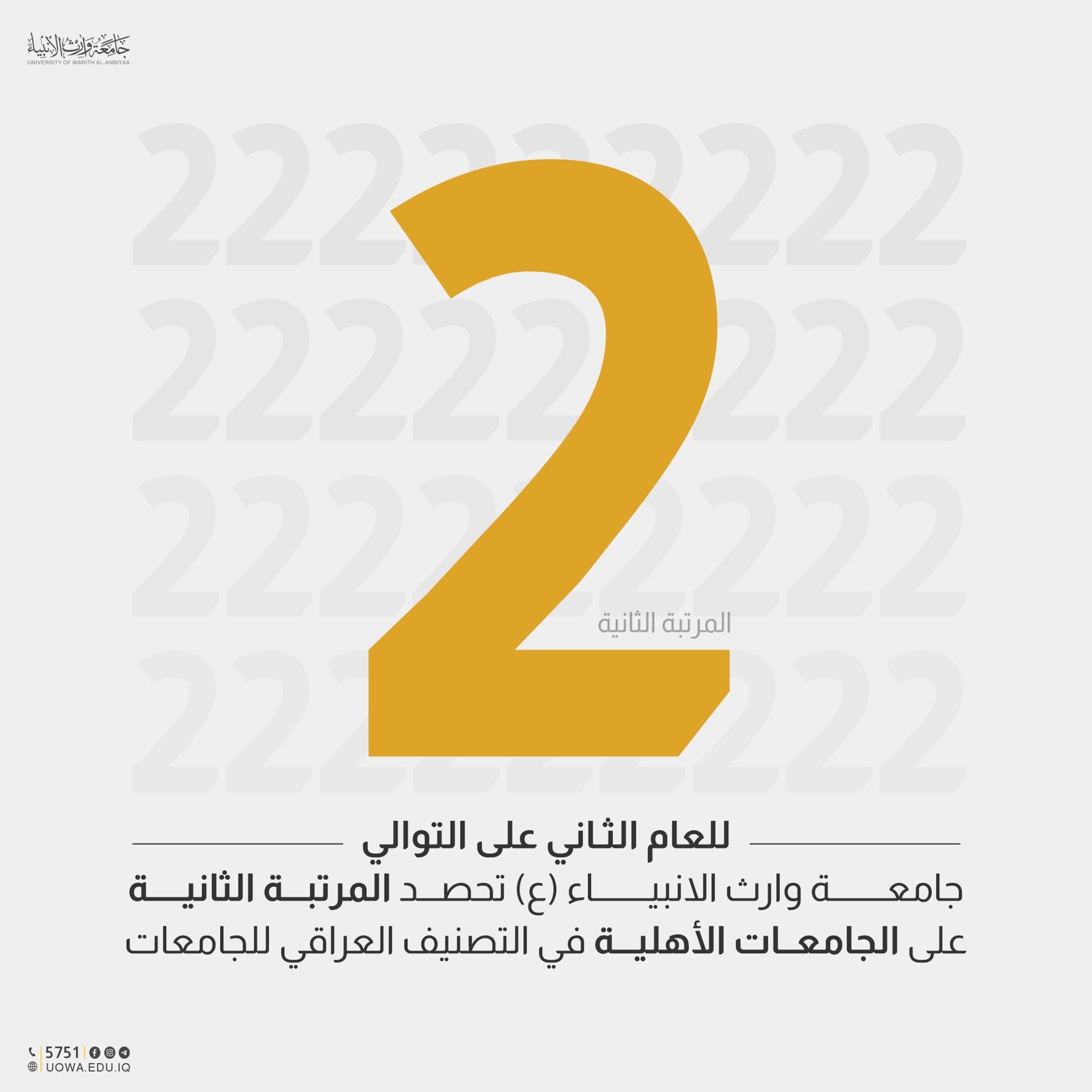 حققت جامعة وارث الانبياء (عليه السلام) انجازا اكاديميا جديدا بحصولها على المرتبة الثانية على مستوى الجامعات الاهلية في العراق للعام الثاني على التوالي وذلك وفق نتائج التصنيف العراقي للجامعات للعام 2025 الذي اعلنته وزارة التعليم العالي والبحث العلمي.