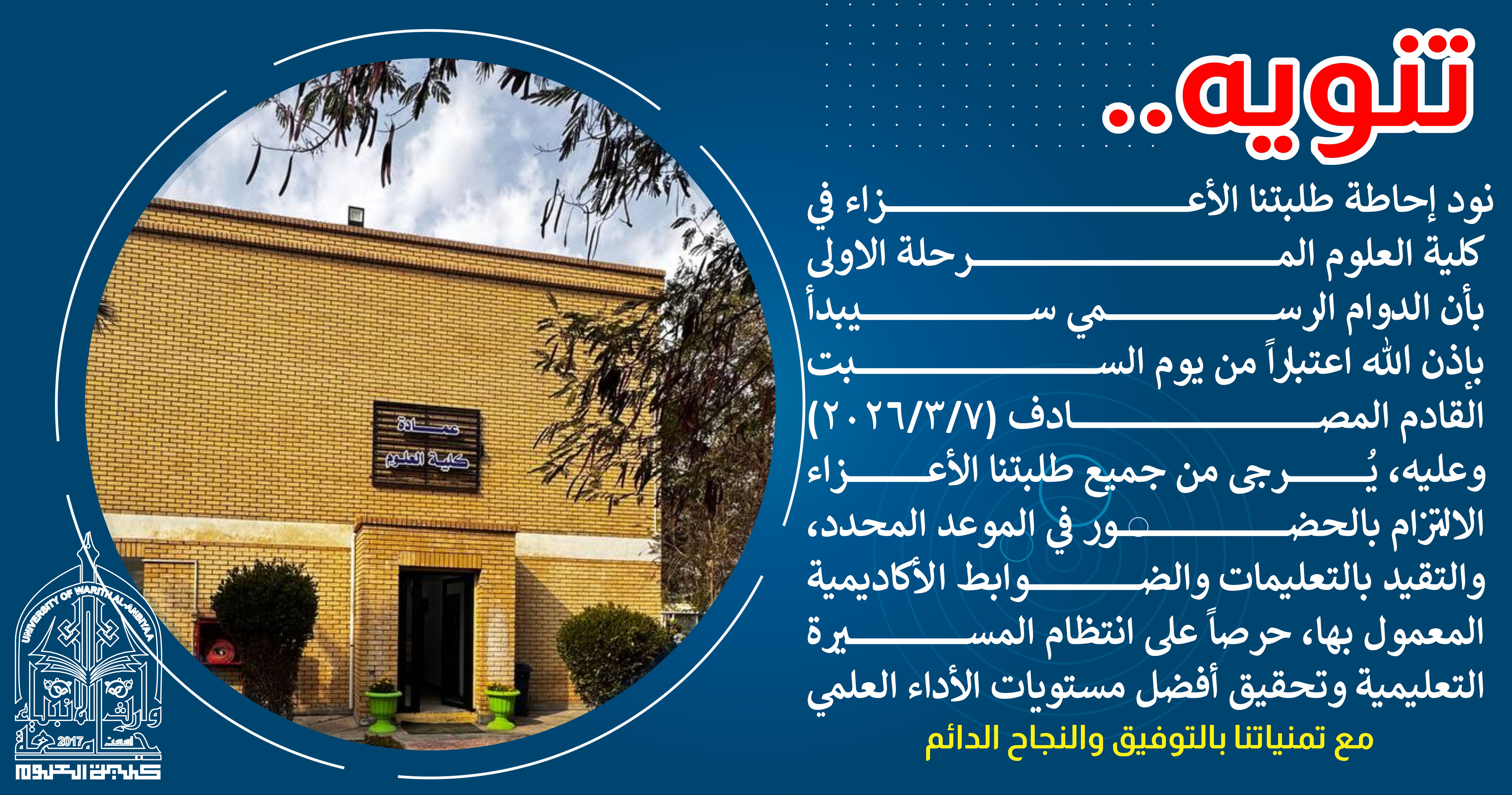 حرصا على تفعيل الخدمة التطوعية ودعم العمل التطوعي جامعة وارث الانبياء وبالتعاون مع جمعية الهلال الاحمر العراقية فرع كربلاء المقدسة تقيم ورشة عمل للاسعافات الاولية لطلبة الجامعة، وقال مدرب جمعية الهلال الأحمر صباح الهلالي ان ورشة العمل تضمنت عملية تثقيف بمبادئ الهلال الاحمر والية العمل وكيفية المساعدة في الحالات الاولية للمصاب، واضاف قائلا انه كان هناك تعاون عالي من قبل الجامعة والطلبة وحماس في بذل انفسهم ووقتهم للعمل التطوعي وسيكون هناك برامج مكثفة في الايام القادمة حول كيفية التعامل مع المصاب واسعافه بصورة الصحيحة.