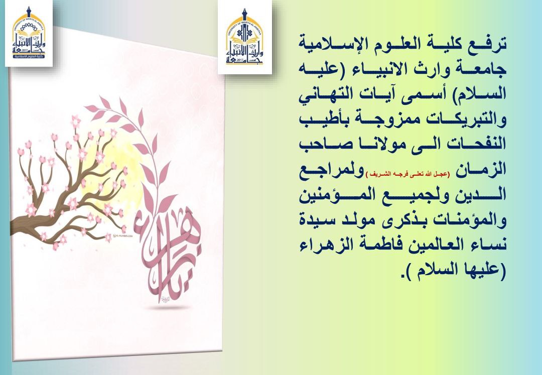ترفع كلية العلوم الإسلامية جامعة وارث الانبياء (عليه السلام) أسمى آيات التهاني والتبريكات ممزوجة بأطيب النفحات الى مولانا صاحب الزمان (عجل الله تعلى فرجه الشريف ) ولمراجع الدين ولجميع المؤمنين والمؤمنات بذكرى مولد سيدة نساء العالمين فاطمة الزهراء (عليها السلام ).