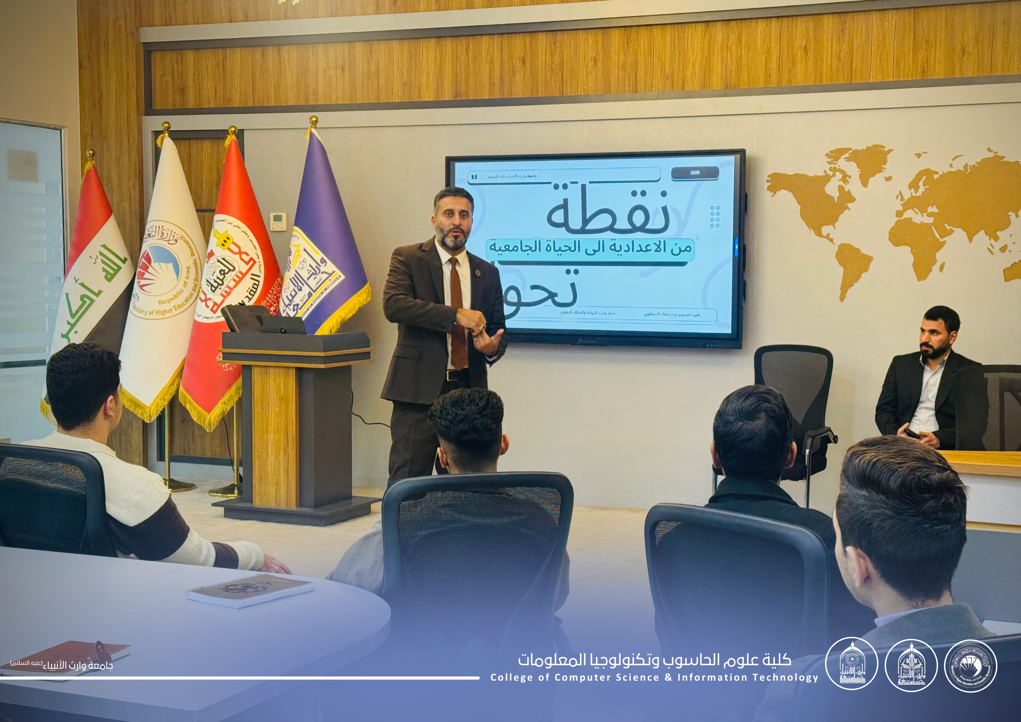 As part of the second axis of economic development for Iraqi women, the Women’s Affairs Unit at the College of Science, Al-Warith Al-Anbiyaa University, organized an educational seminar on “Empowering Iraqi Women in Sustainable Economic Development” on December 3, 2025. The seminar was delivered by Assistant Lecturers Ilaf Ali Safouk and Saja Basim.