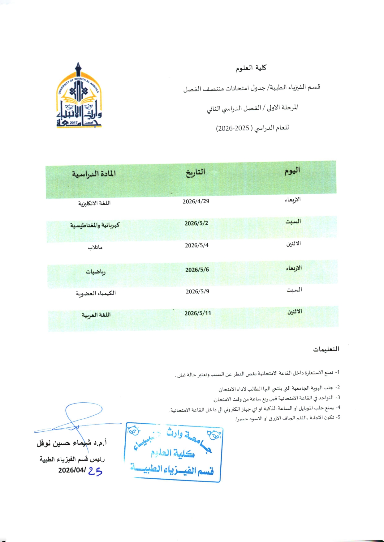 Accordingly, the College invites all students to review the schedule published on the official website and to strictly adhere to the specified exam dates and times.