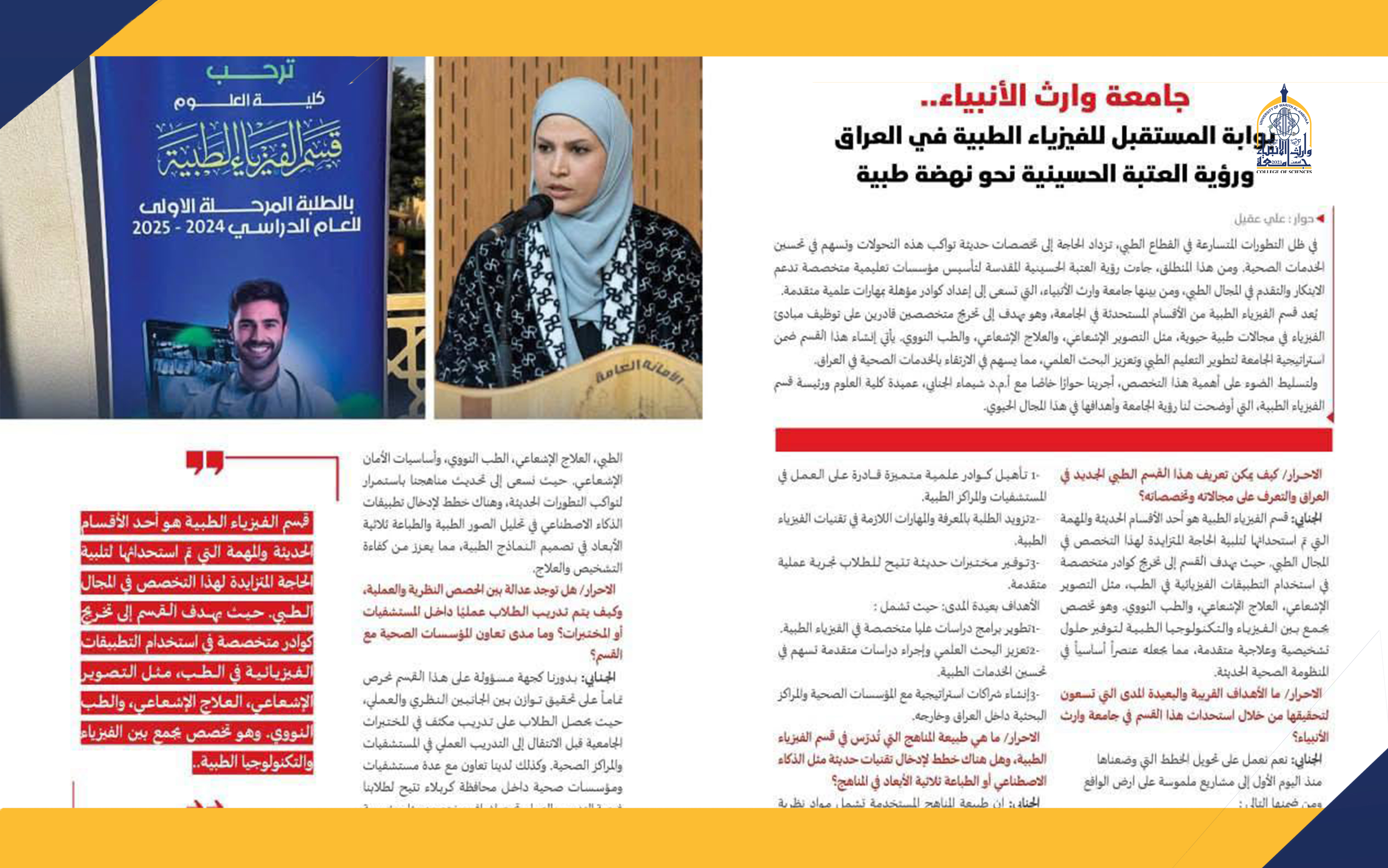 The article highlights the Medical Physics Department at the College of Science, University of Warith Al-Anbiyaa (peace be upon him), emphasizing its vital role in academic and scientific development.