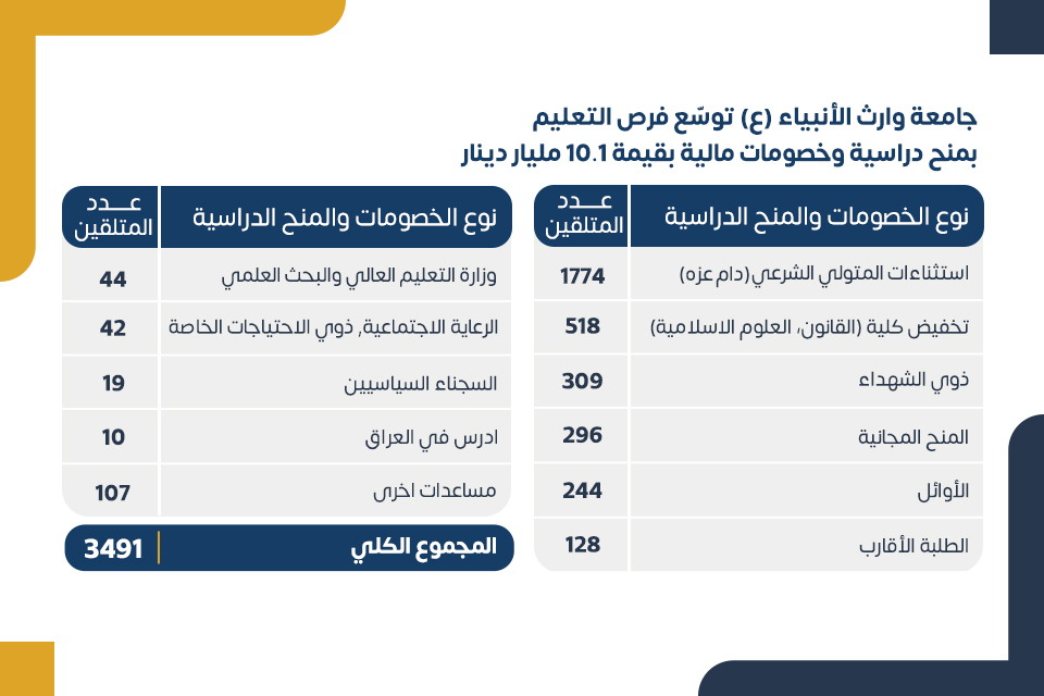 في إطار التزامها بتوفير فرص التعليم العالي لجميع الأفراد، بغض النظر عن خلفياتهم الاجتماعية والاقتصادية، تواصل جامعة وارث الأنبياء (عليه السلام) تقديم الدعم الأكاديمي والمالي لطلبتها، من خلال المنح الدراسية والخصومات التي تشمل الطلبة العراقيين وغير العراقيين المستوفين لمعايير محددة.