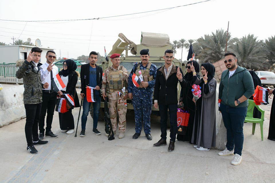 فريق الخوذة البيضاء الطلابي ...يشاركون الجيش العراقي فرحتهم ويوزعون الورود والاعلام العراقية .