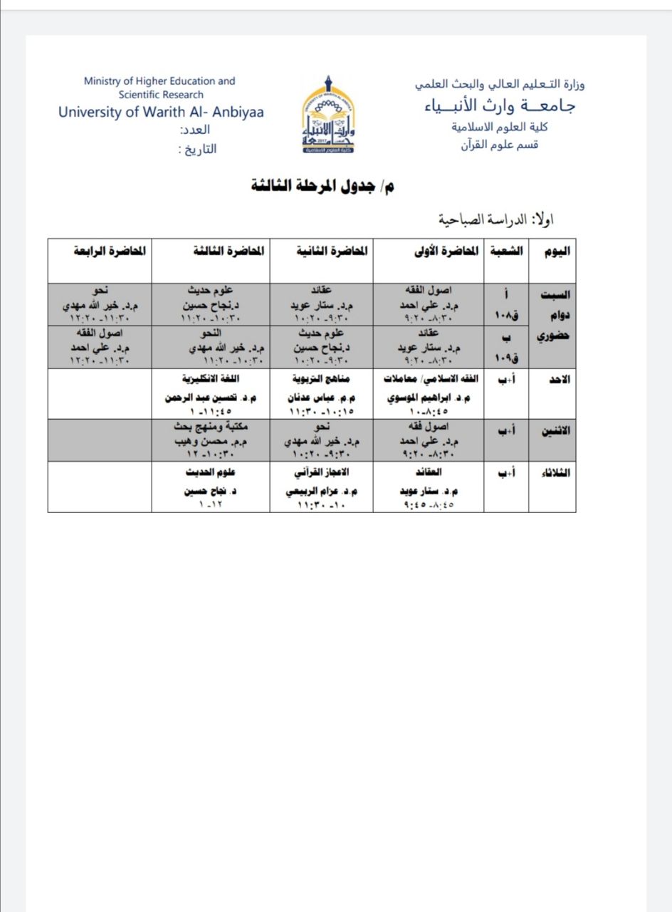جدول الدروس اليومي للمرحلة الثالثة / الدراسة الصباحية والمسائية / قسم علوم القرآن