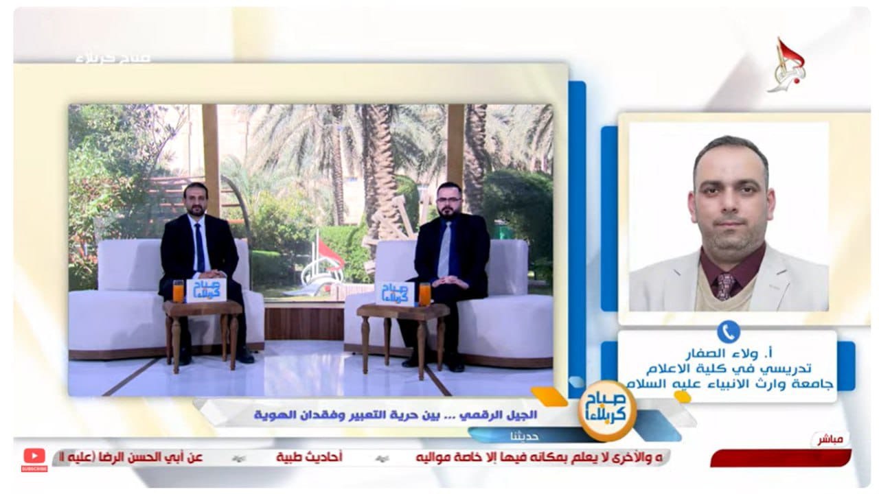 استضافت قناة كربلاء الفضائية ضمن برنامجها اليومي (صباح كربلاء) التدريسي في كلية الاعلام في جامعة وارث الانبياء (عليه السلام) الاستاذ ولاء الصفار لمناقشة موضوع الجيل الرقمي بين حرية التعبير وفقدان الهوية.