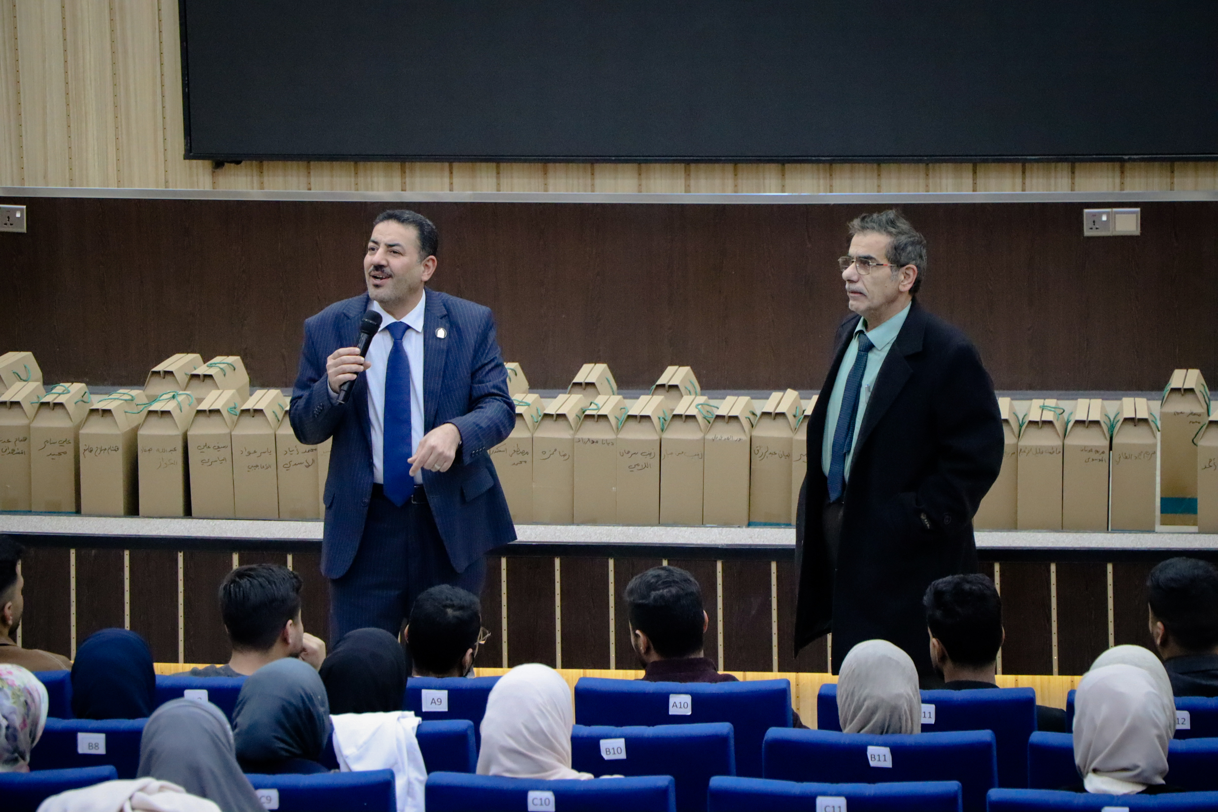 ألقى الأستاذ الدكتور عميد كلية الطب، علي عبد سعدون الغزي، يرافقه معاون العميد للشؤون العلمية، الدكتور علي عبد الرضا الغره، كلمة توجيهية لطلبة المرحلة السادسة بمناسبة تخرجهم، وذلك تزامناً مع تسلّمهم روب التخرج والقبعة.