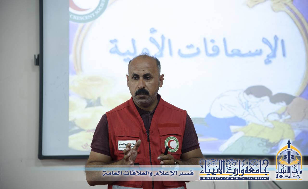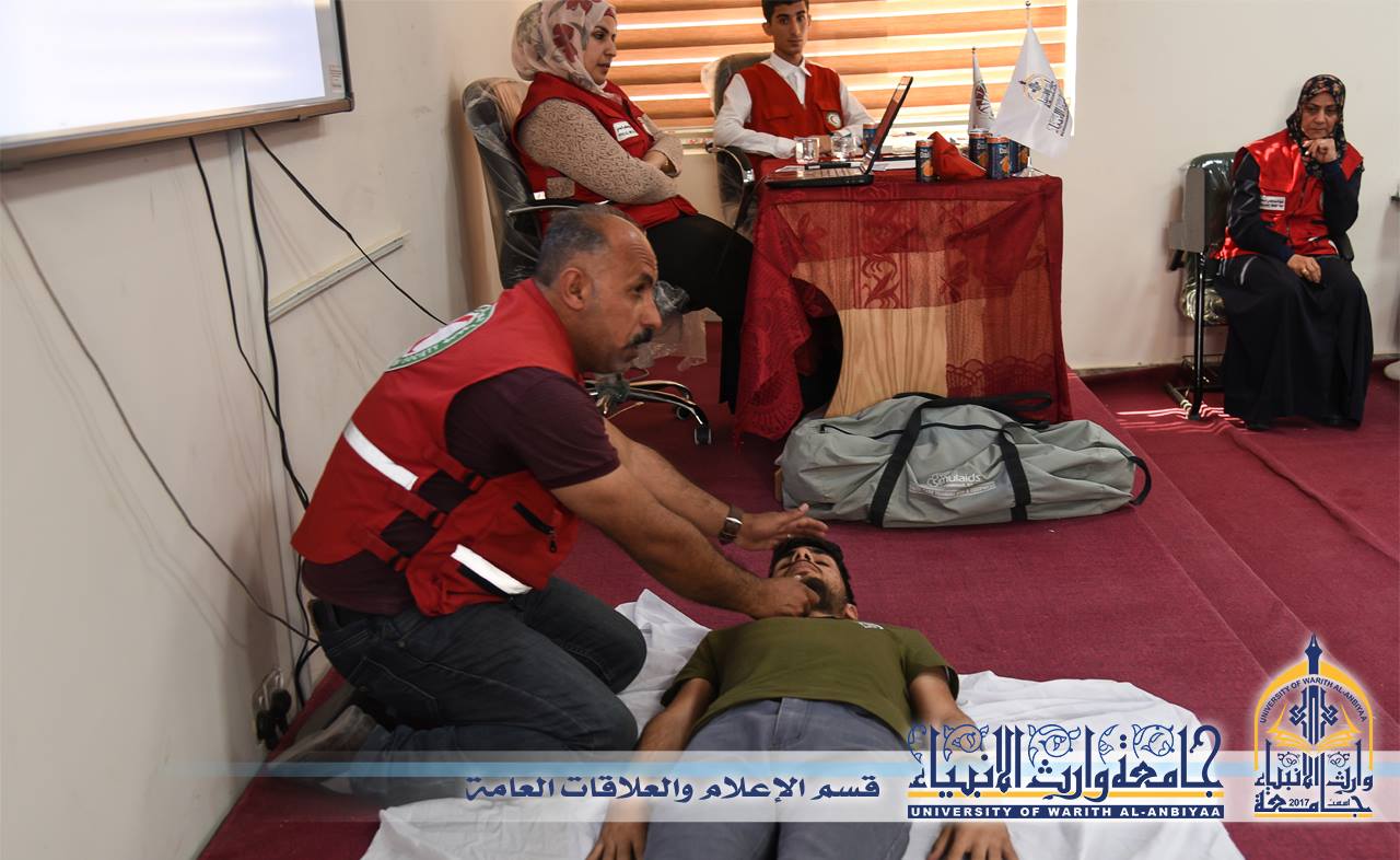 حرصا على تفعيل الخدمة التطوعية ودعم العمل التطوعي جامعة وارث الانبياء وبالتعاون مع جمعية الهلال الاحمر العراقية فرع كربلاء المقدسة تقيم ورشة عمل للاسعافات الاولية لطلبة الجامعة، وقال مدرب جمعية الهلال الأحمر صباح الهلالي ان ورشة العمل تضمنت عملية تثقيف بمبادئ الهلال الاحمر والية العمل وكيفية المساعدة في الحالات الاولية للمصاب، واضاف قائلا انه كان هناك تعاون عالي من قبل الجامعة والطلبة وحماس في بذل انفسهم ووقتهم للعمل التطوعي وسيكون هناك برامج مكثفة في الايام القادمة حول كيفية التعامل مع المصاب واسعافه بصورة الصحيحة.