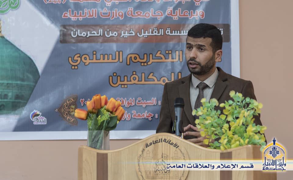 احتضنت جامعة وارث الانبياء احتفال مؤسسة (القليل خير من الحرمان الخيرية )بالأطفال الايتام الذين بلغوا سن التكليف الشرعي من الذكور والإناث ،وقال رئيس المؤسسة ازهر علي الركابي نحن اليوم سعداء جدا لأننا في رحاب جامعة وارث الأنبياء ونحن نحتفل بابناء المؤسسة من العوائل المتعففة والأيتام ببلوغهم سن التكليف الشرعي وان احتضان الجامعة لهذا الحفل هو طفرة نوعية وثقافية غايتها رسم صورة للأيتام الإعزاز ان صورتهم المستقبلية هي الجامعة وهي مكانهم ،وايضا لرد الجميل للذين ضحوا من اجل هذا الوطن وترك بصمة في نفوس هؤلاء الأعزاء، واختتم الحفل بتكريم الأعزاء بالهدايا