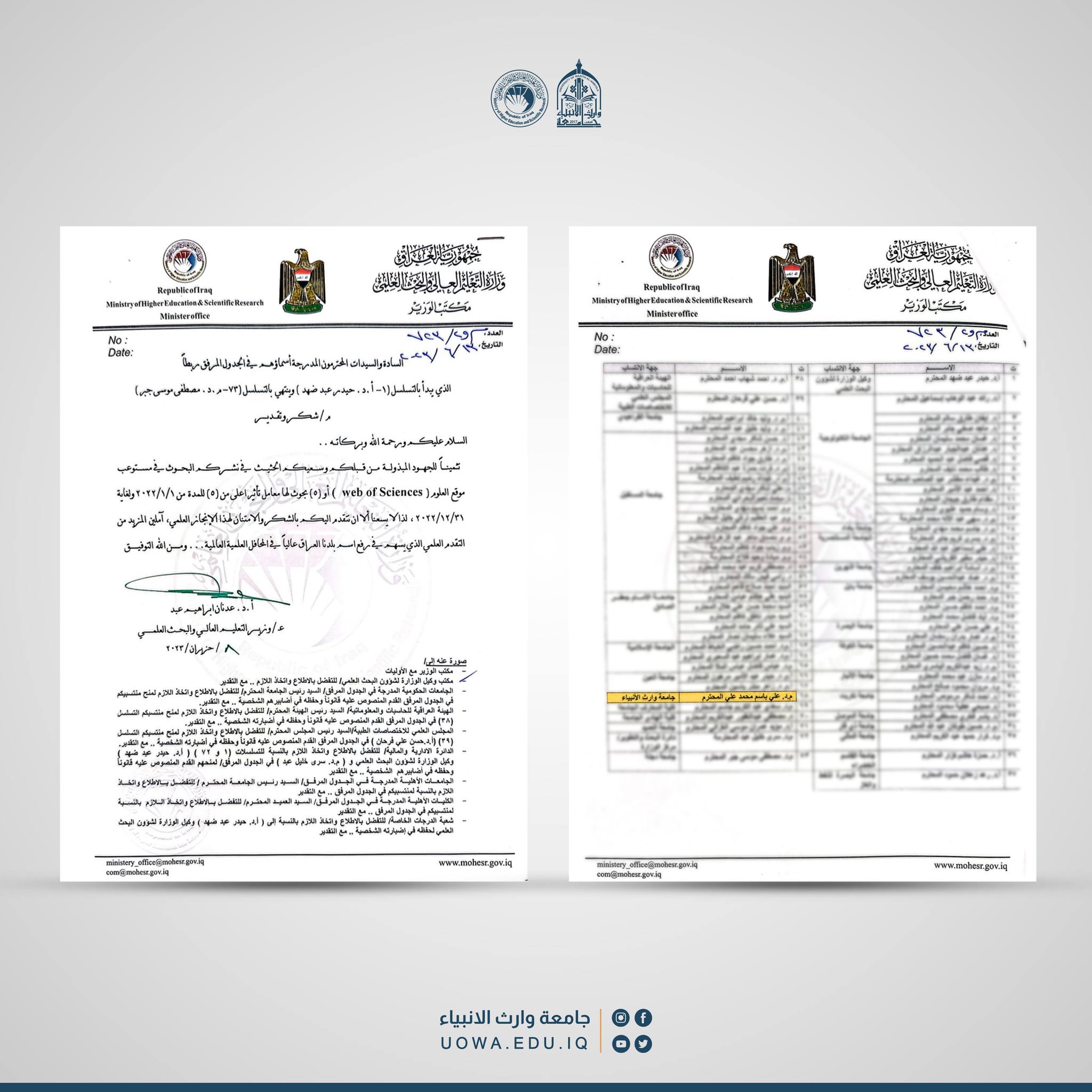 قدم وزير التعليم العالي والبحث العلمي كتاب شكر وتقدير للباحثين المتميزين عن جهودهم القيمة وسعيهم الحثيث في نشر البحوث العلمية في مستوعب موقع العلوم (Web of Science)، والتي تتمتع بمعامل تأثير يزيد عن(5).