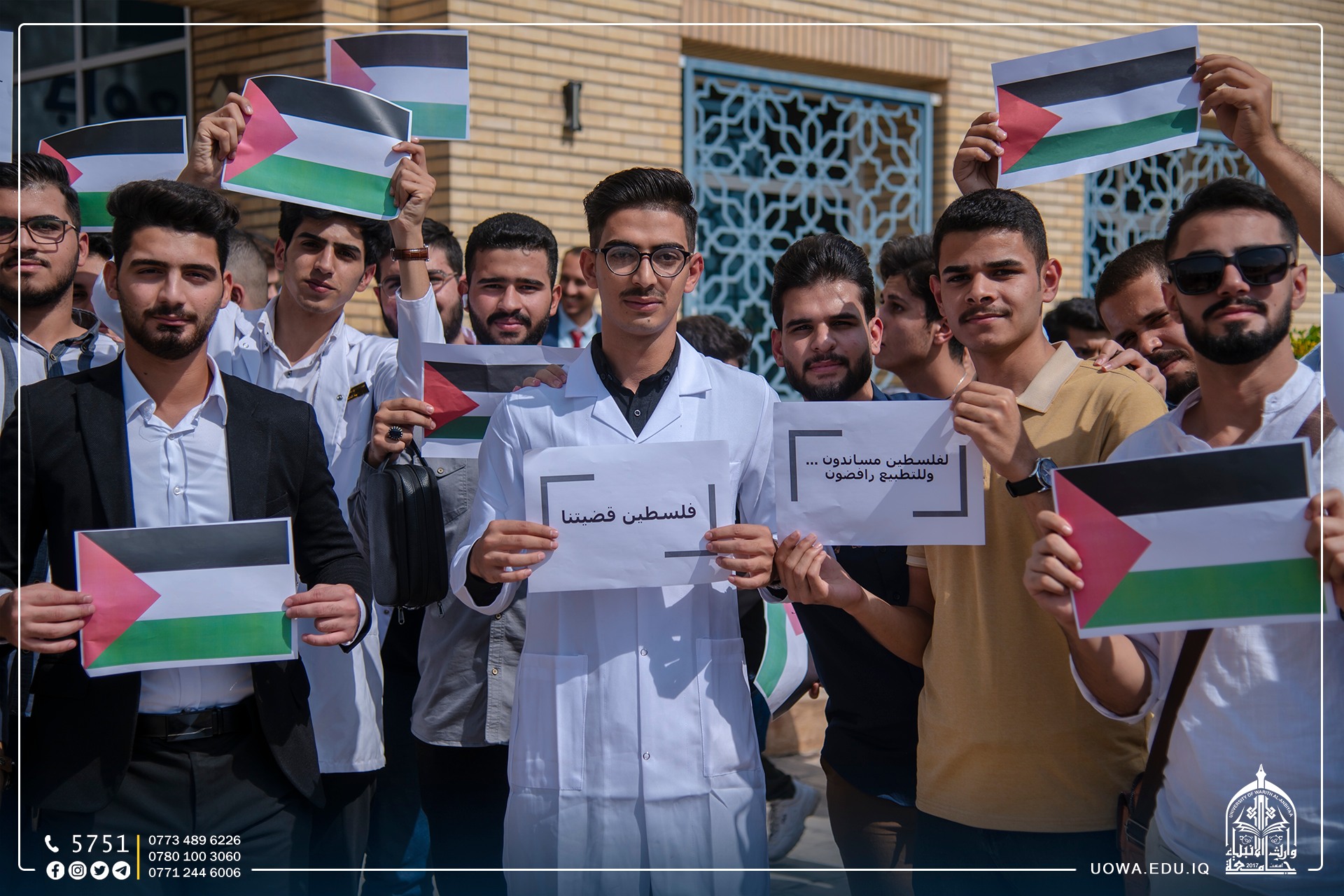 جامعة وارث الانبياء(عليه السلام) تنظم وقفة تضامنية مع الشعب الفلسطيني، وتؤكد مساندتها للشعب الفلسطيني الأبيّ في مقاومته الباسلة للمحتلين، وإن العالم كله مدعوّ للوقوف في وجه هذا التوحش الفظيع ومنع تمادي قوات الاحتلال عن تنفيذ مخططاتها لإلحاق مزيد من الأذى بالشعب الفلسطيني المظلوم، ويجري هذا بمرأى ومسمع العالم كله ولا رادع ولا مانع، بل هناك من يساند هذه الأعمال الإجرامية ويبرّرها بذريعة الدفاع عن النفس!