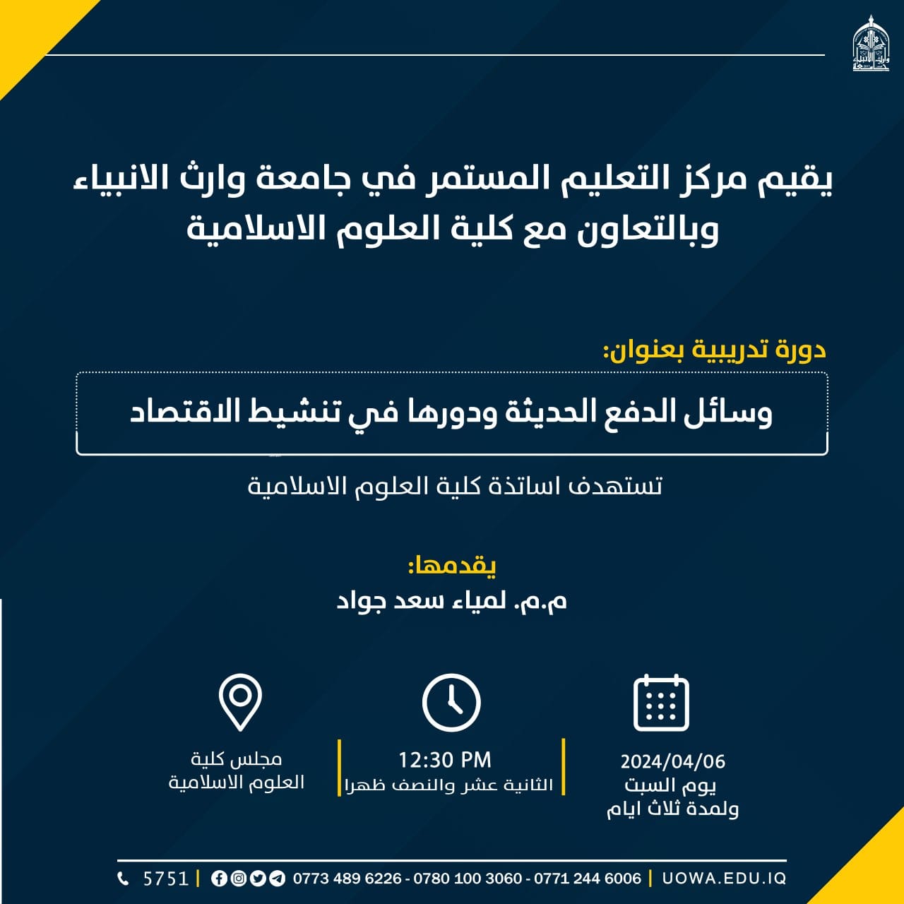 في إطار التعاون المثمر بين مركز التعليم المستمر في جامعة وارث الأنبياء وكلية العلوم الإسلامية، انطلقت بتاريخ 6 أبريل 2024 دورة تدريبية بعنوان "وسائل الدفع الحديثة ودورها في تنشيط الاقتصاد".