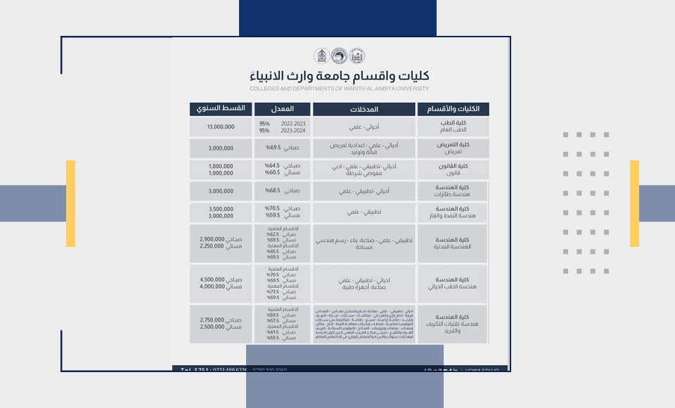 في إطار سعي جامعة وارث الأنبياء (عليه السلام) لإعداد كوادر طبية مؤهلة تسهم في الارتقاء بالقطاع الصحي في العراق،كلية الصيدلة وكلية طب الأسنان تقدم برامج أكاديمية متميزة