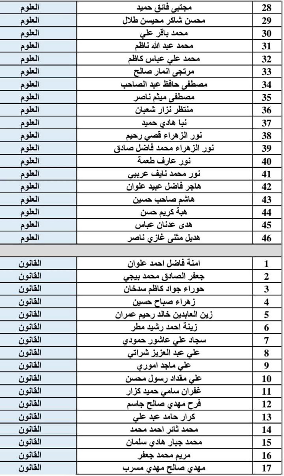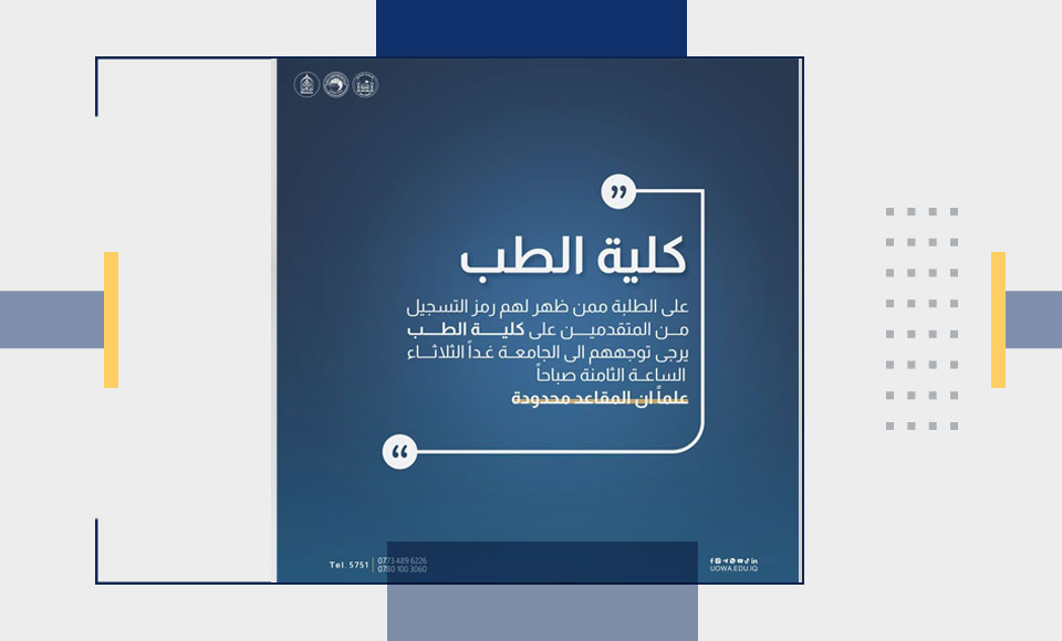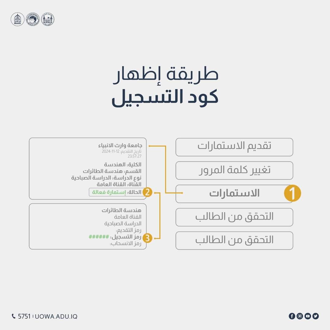 - الى الطلبة الأعزاء غدا الاحد تبدأ عملية تسجيل الطلبة المقبولين (الوجبة الاولى الإصلاء الذين ظهر لهم كود التسجيل) ،وبعدها يتم رفع بقية الوجبات وحسب المقاعد المتوفرة.