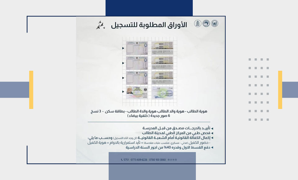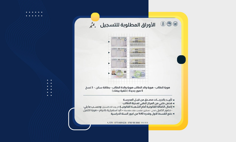 الدفعة الاولى البالغ قدرها 40% من القسط الكليويشمل ذلك جميع الطلبة، اضافة للطلبة الذين لديهم تخفيضات.أجور فتح الملف: تحدد رسوم فتح الملف بمبلغ 50000دينار.رسوم تفعيل تطبيق "قدم" عبر بطاقة ماستر كارد: تحدد بمبلغ 66,000دينار.يظهر للطالب عبارة "متاح للتسجيل " عندها يمكنه جلب كود التسجيل الى الجامعة.المستمسكات المطلوبة لعملية التسجيل:- كود التسجيل (ويتم الحصول عليه من خلال التطبيق).- الوثيقة الدراسية المصدقة اوتأييد بالدرجات- شهادة الجنسية وهوية الأحوال المدنية أو البطاقة الوطنية الموحدة (للطالب والاب والام).- صور حديثة عدد ٦- استمارة الفحص الطبي #ان_وجد-حضور الكفيل مع تأييد استمراية الخدمة وهوية الدائرة( يمكن جلب الكفيل خلال شهر من تاريخ التسجيل)-جلب الدفعة الاولى من القسط السنوي والبالغ ٤٠%-بطاقة #دفع_إلكتروني لدفع مبلغ 66 الف دينار إلكترونياً لتفعيل البرنامج الطالب الوزاري.نود اعلام الطلبة الاعزاء ان فريق التسجيل متواجد طيلة ايام الاسبوع من الساعة 8صباحا الى 5 مساءللاستفسار يرجى الاتصال على الأرقام التالية:الرقم المختصر :575107734896226