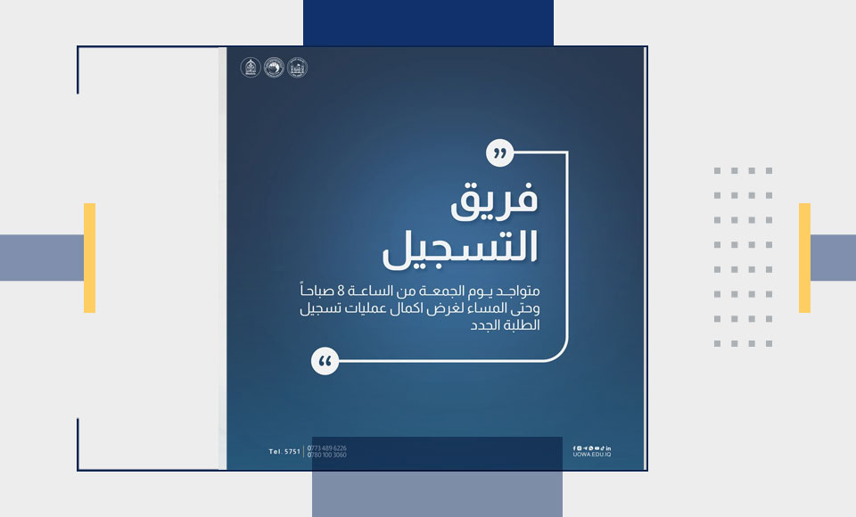 نود اعلام الطلبة الاعزاء ان فريق التسجيل متواجد طيلة ايام الاسبوع من الساعة 8صباحا الى 5 مساء