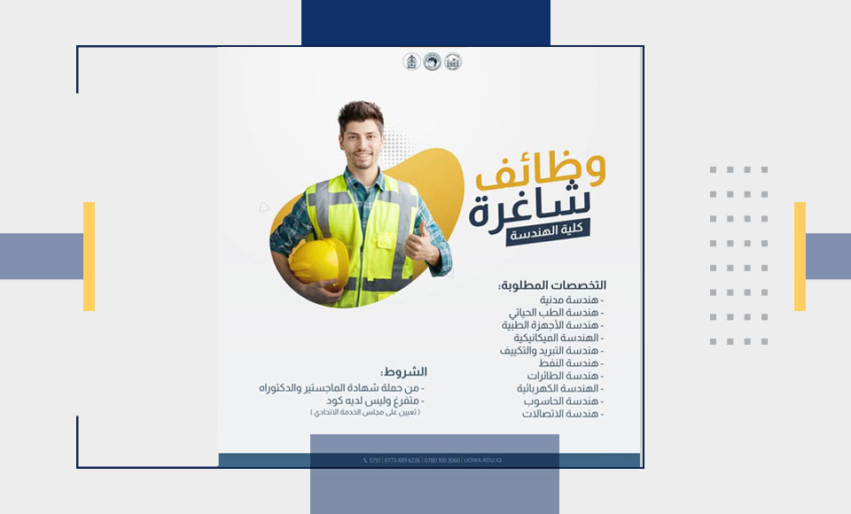 أعلنت جامعة وارث الأنبياء (عليه السلام)، عن توفر درجات وظيفية شاغرة في كلية الهندسة لحملة شهادة البكالوريوس، على أن تكون الفرص مخصصة حصراً لخريجي الجامعة.