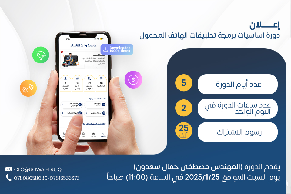 يسر مركز التعليم المستمر في جامعة وارث الأنبياء (عليه السلام) الإعلان عن فتح باب التسجيل على دورة تقوية للمحاسبة المتوسطة ، التي ستبدأ في 22/11/2025، يقدمها المدرس المساعد فوزية حسين الهلالي.