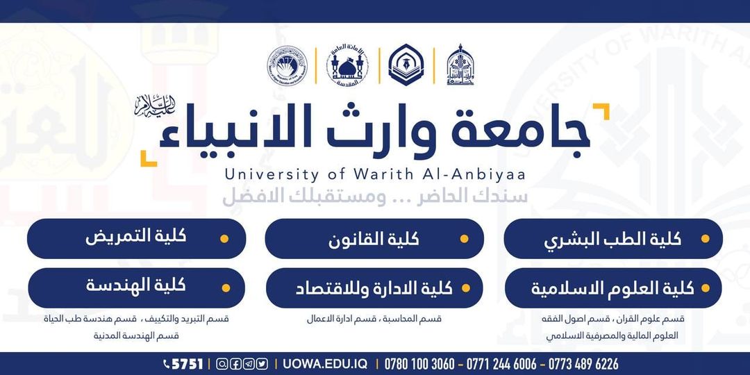 يسر جامعة وارث الأنبياء أن تعلن للطلبة الاعزاء الراغبين ببدء اولى خطواتهم في طريق النجاح عبر التقديم على كليات واقسام الجامعة، للعام الدراسي (2022-2023)