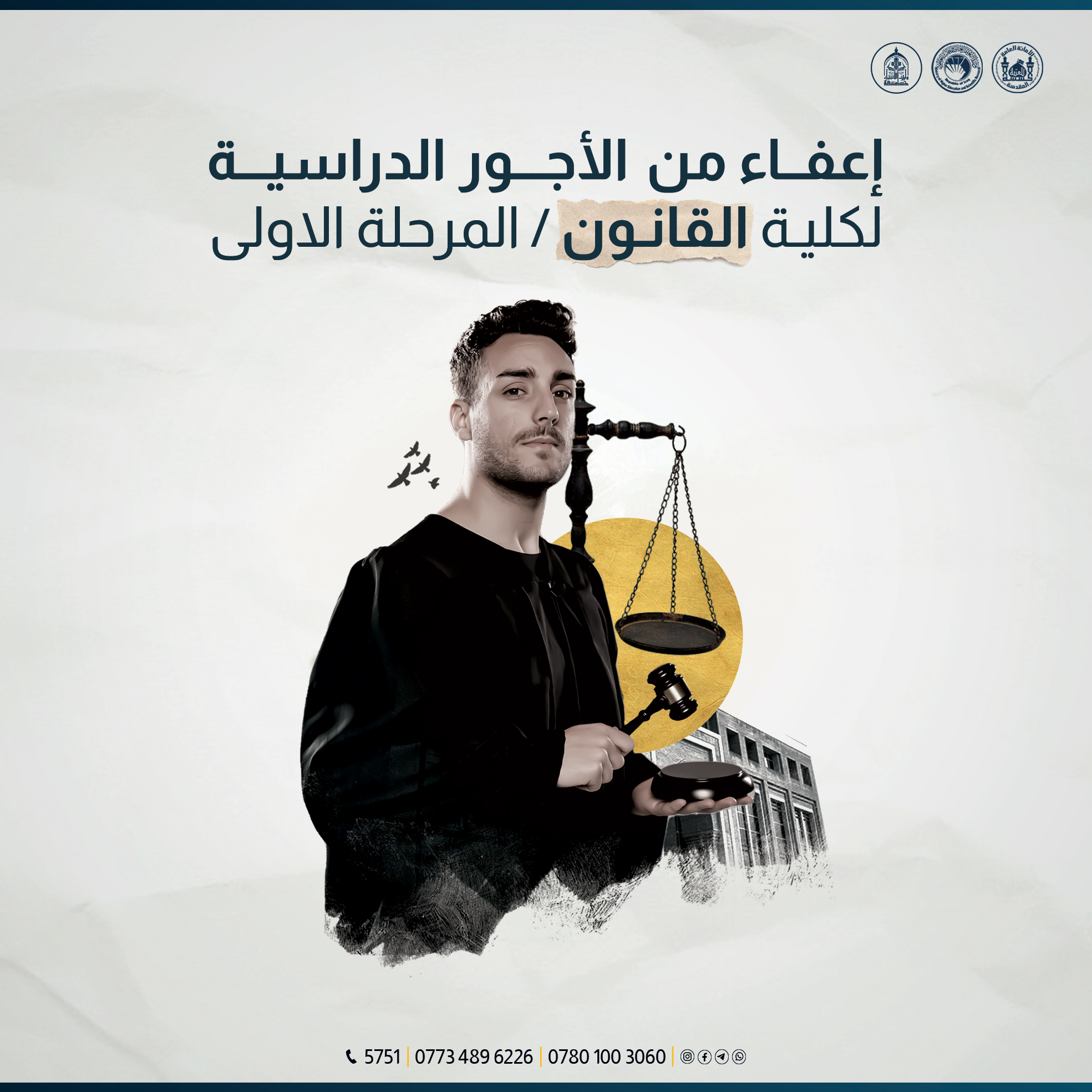 انطلاقا من نهج العتبة الحسينية المقدسة وتوجيهات سماحة المتولي الشرعي الشيخ عبد المهدي الكربلائي دام عزه نحو التماس سبل التعاون البناء وتحقيق اواصر المساهمة الفاعلة بين الجامعة والمجتمع قررت جامعة وارث الانبياء (عليه السلام)، إعفاء الطلبة المتقدمين إلى كلية القانون المرحلة_الأولى للعام الدراسي الحالي ٢٠٢٣-٢٠٢٤ من القسط الدراسي ليكون حافزاً أمام شبابنا الواعي في اعتلاء سلم العلم و تحقيق حلمهم الدراسي نحو مستقبل واعد...
