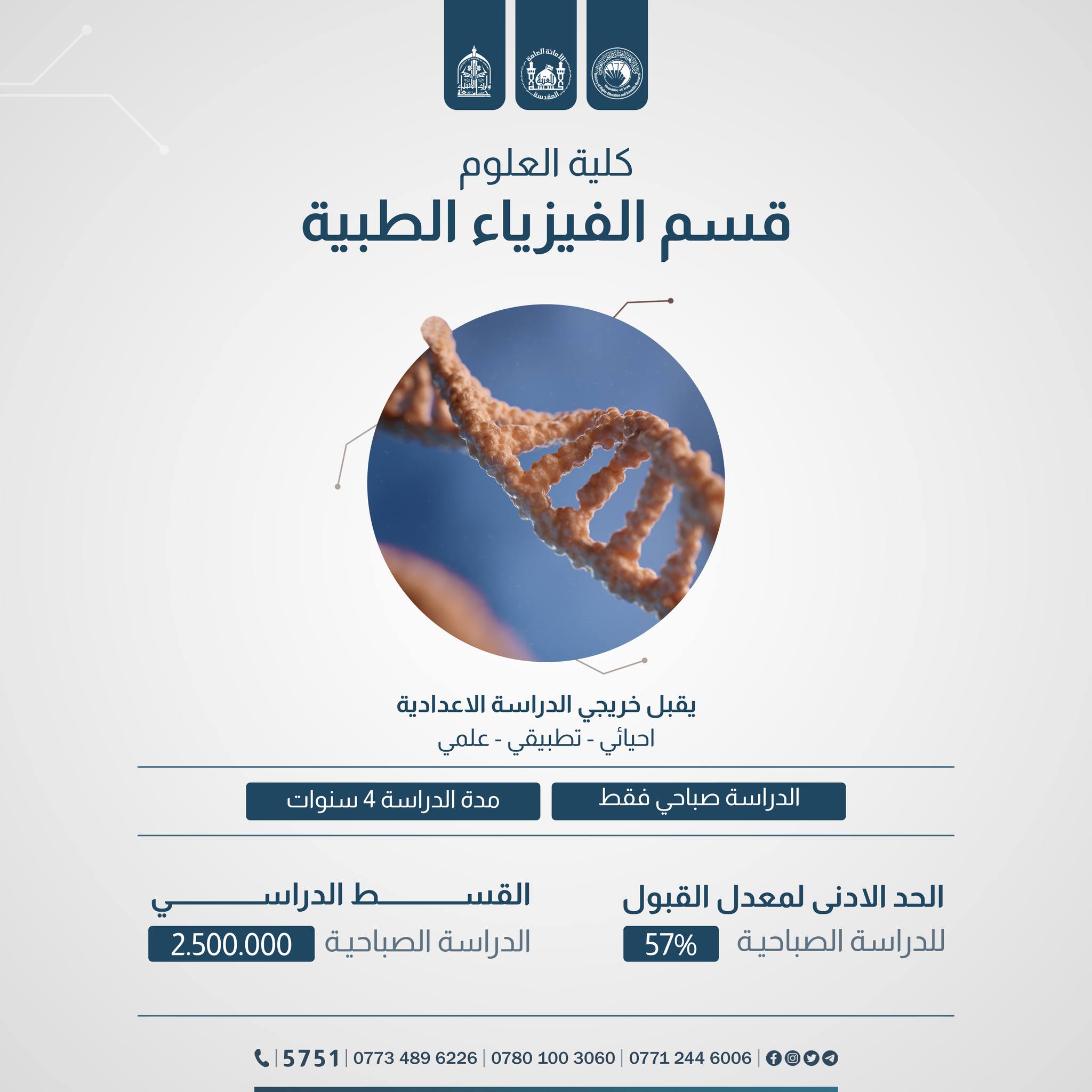 قسم الفيزياء الطبيّة هو أحد الأقسام #الطبية_الساندة الذي يعمل على تأهيل #أخصائيين في الفيزياء الطبية، على درجة عاليّة من المهارة العلميّة والفنيّة للمساهمة في تلبية احتياجات سوق العمل والارتقاء بهذا المجال.
