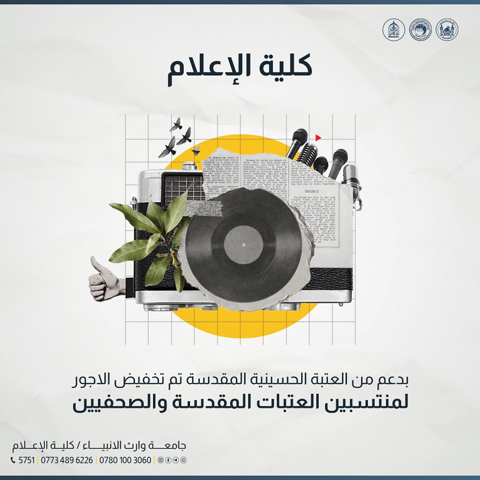 جامعة وارث الانبياء(عليه السلام) وبدعم من العتبة الحسينية المقدسة تقدم مجموعة من التخفيضات الخاصة لمنتسبي العتبات المقدسة والصحفيين الراغبين بالتقديم على كلية الإعلام بقسميها الإعلام الرقمي،والعلاقات العامة.