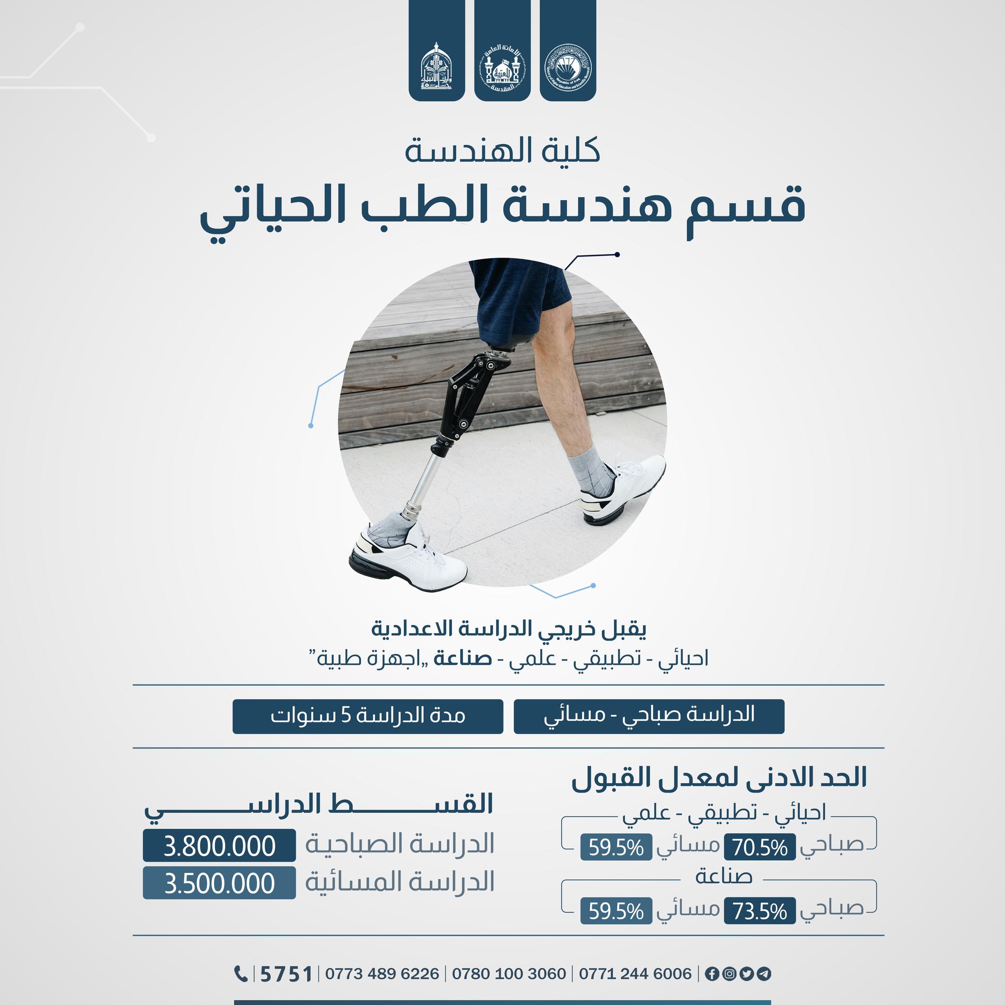 تعلن جامعة وارث الأنبياء (عليه السلام) عن استحداث (الدراسة المسائية) لقسم هندسة الطب الحياتي.