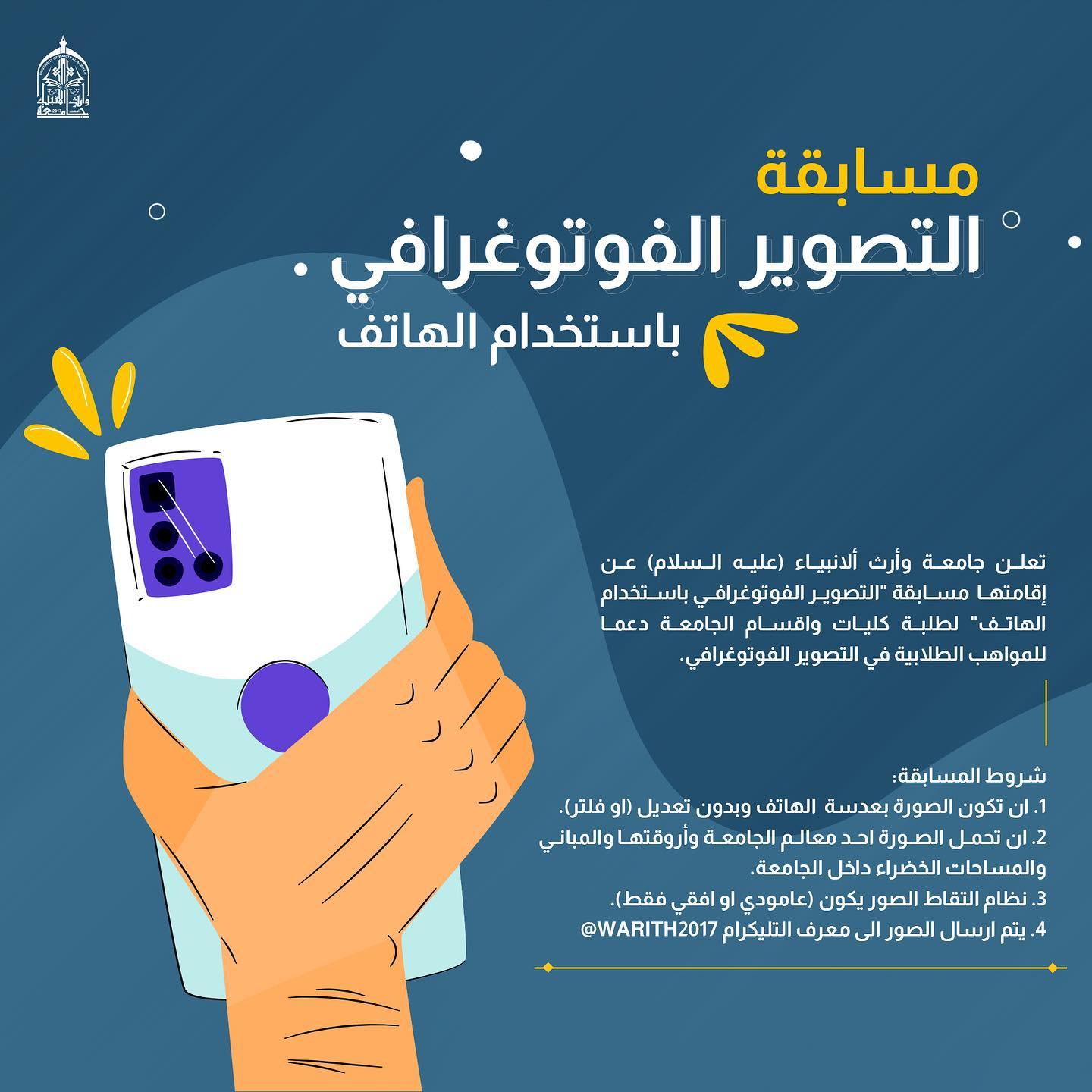 أعلان مسابقة للتصوير الفوتوغرافي بإستخدام الهاتف لطلبة جامعة وارث الانبياء (علية السلام) للاشتراك أرسال الصورة على معرفنا في التليكرام @Warith2017