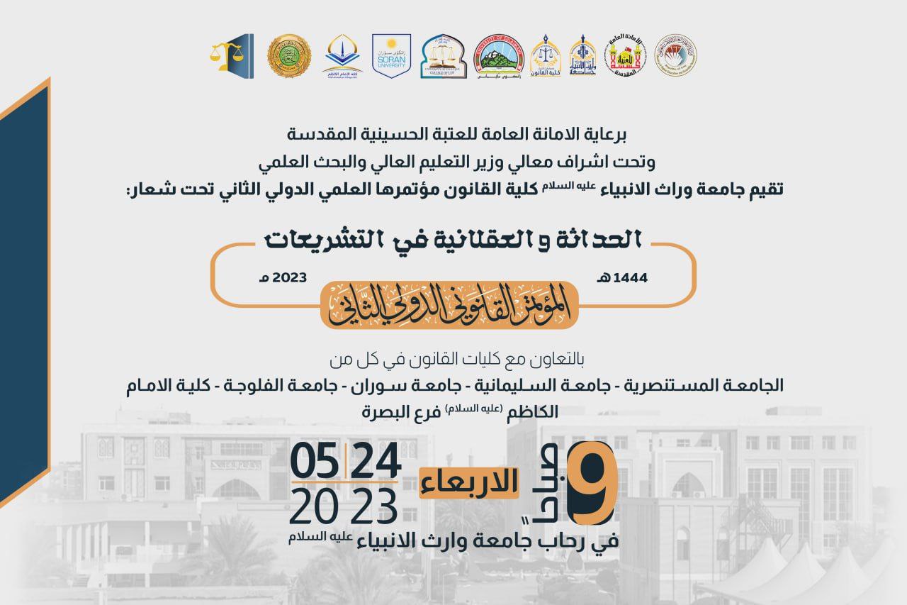 تدعوكم جامعة وارث الانبياء(عليه السلام) لحضور "المؤتمر القانوني الدولي الثاني" تحت شعار الحداثةوالعقلانية في التشريعات" اليوم الاربعاء المصادف 24-5-2023