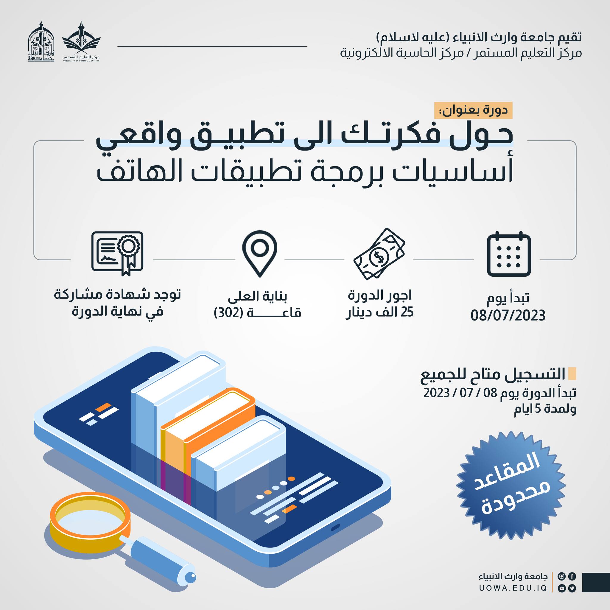 يعلن مركز التعليم المستمر في جامعة وارث الأنبياء (عليه السلام)، بالتعاون مع مركز الحاسبة الالكترونية، عن فتح باب التسجيل في الدورة التدريبية المتميزة بعنوان "حول فكرتك إلى تطبيق واقعي". إذا كنت تحلم بتحويل فكرتك الإبداعية إلى تطبيق حقيقي على الهواتف الذكية، فهذه هي الفرصة المثالية لك