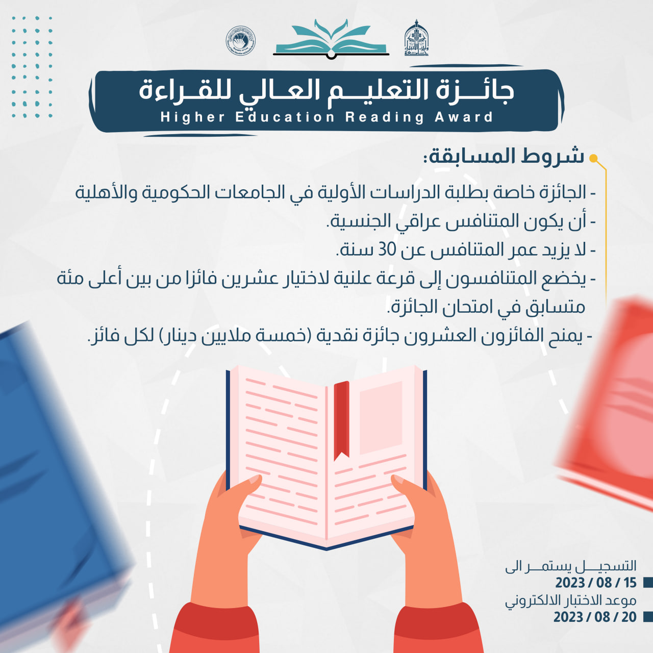 طلقت وزارة التعليم العالي والبحث العلمي مسابقة "جائزة التعليم العالي للقراءة" الخاصة بطلبة الدراسات الأولية في الجامعات العراقية كافة, والتي قيمتها "مئة مليون دينار" تتوزع على عشرين فائزا، وتستند الجائزة الى التنافس على قراءة كتاب (شروط النهضة) للمفكر العربي مالك بن نبي.