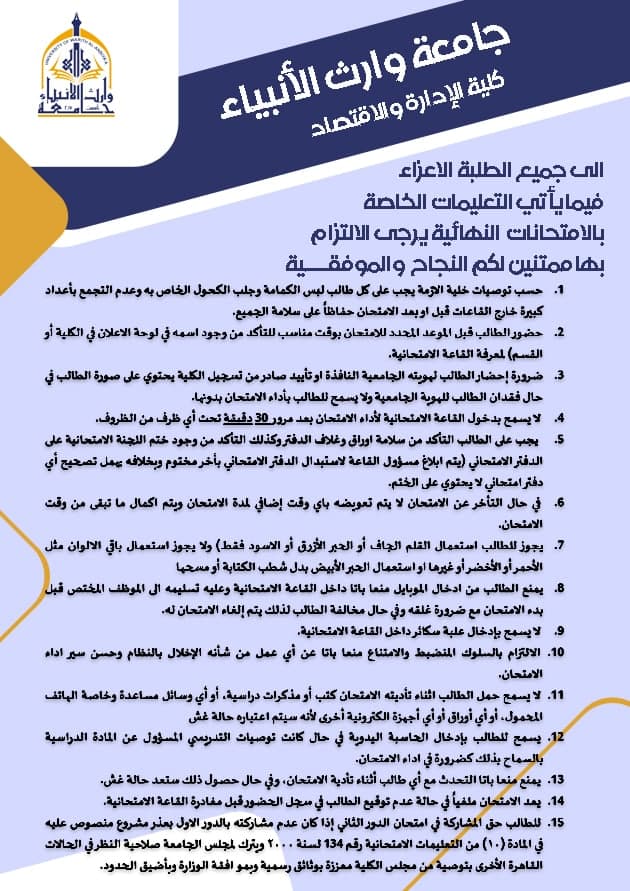 استمرار اداء الامتحانات الحضورية لطلبة كلية الادارة والاقتصاد بقسميها المحاسبة وادارة الاعمال، وبإشراف السيد عميد الكلية الاستاذ الدكتور عواد الخالدي.