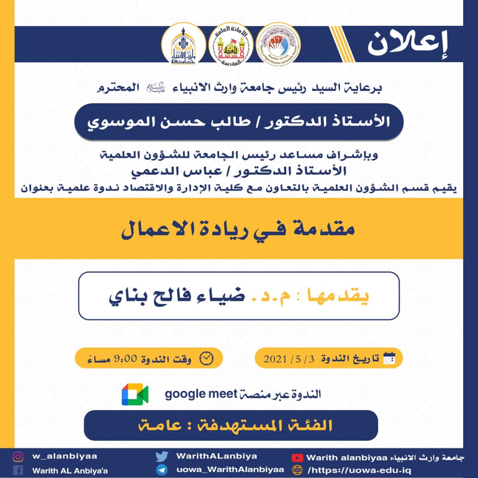 يقيم قسم الشؤون العلمية في جامعة وارث الانبياء(عليه السلام) وبالتعاون مع كلية الادارة والاقتصاد ندوة علمية بعنوان: مقدمة في ريادة الأعمال، يلقيها الدكتور ضياء فالح بناي.