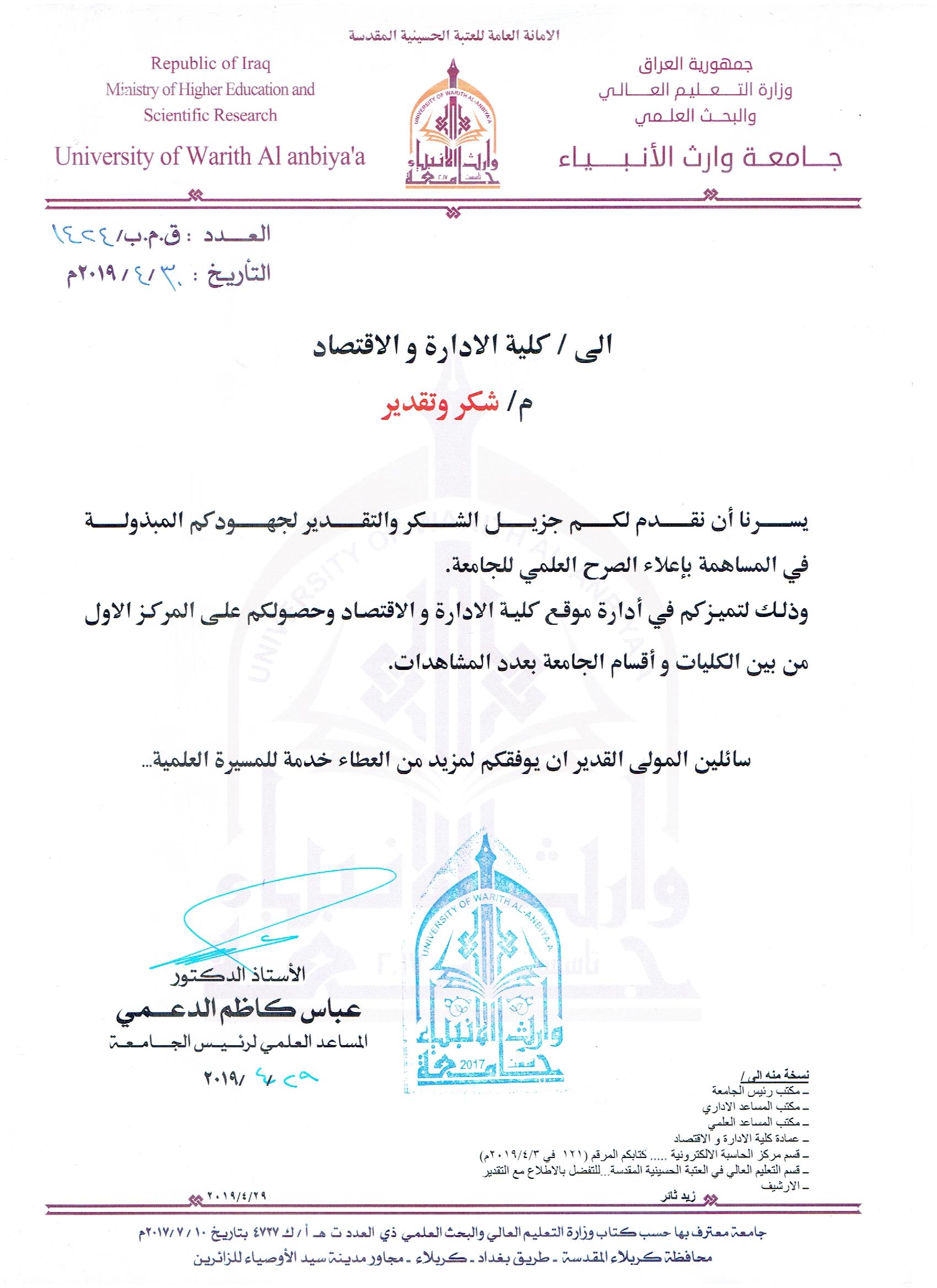 حصلت كلية الادارة والاقتصاد على كتاب شكر وتقدير من قبل أ.د عباس الدعمي المساعد العلمي لرئيس جامعة الوارث الانبياء لتحقيق الكلية المركز الاول بين كليات الجامعة في مجال ادارة الموقع الالكتروني
