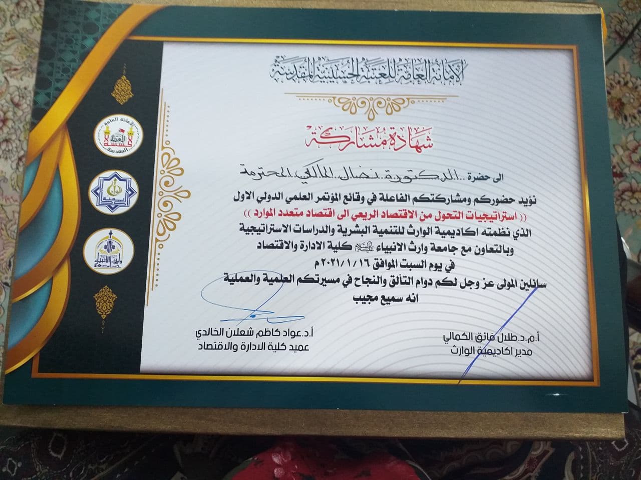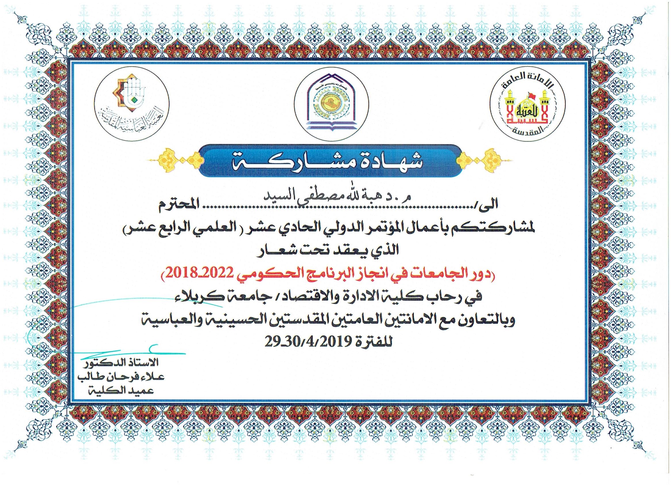 مشاركة تدريسية في مؤتمر علمي —————————————شاركت التدريسية في قسم المحاسبة/ كلية الإدارة والاقتصاد/جامعة وارث الأنبياء(ع) (م.د. هبة الله مصطفى السيد علي ) في المؤتمر الدولي الحادي عشر(العلمي الرابع عشر) الذي اقامته جامعة كربلاء كلية الإدارة والاقتصاد ببحث تحت عنوان..(دور الجامعات في إنجاز البرنامج الحكومي ٢٠١٨-٢٠٢٢ ).