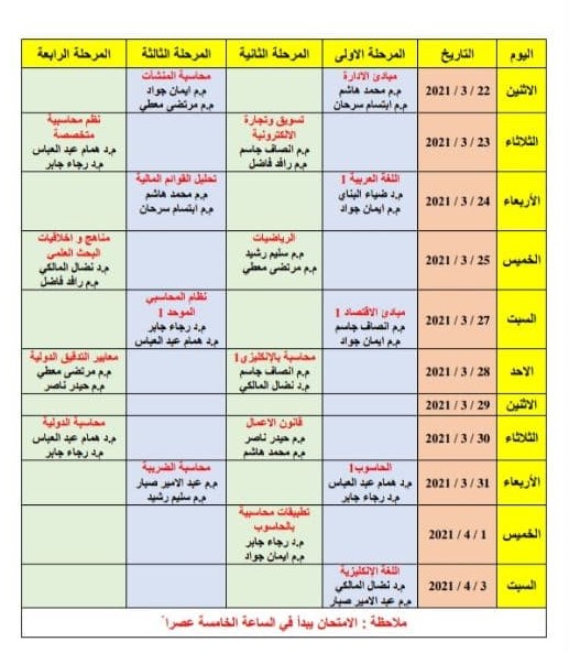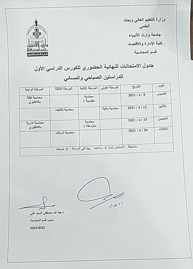 جدول الامتحانات النهائية الحضورية للكورس الاول لقسم المحاسبة وللدراستين الصباحية والمسائية للعام الدراسي 2020-2021