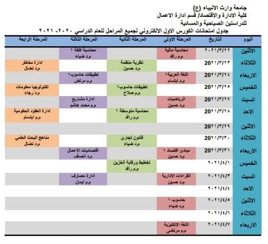 جدول امتحانات الكورس الاول للعام الدراسي 2020-2021 لقسم ادارة الاعمال للدراستين الصباحية والمسائية