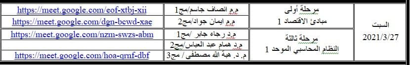جدول مراقبات قسم المحاسبة ليوم السبت الموافق 27/3/2021