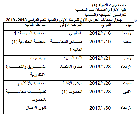 في حالة وجود عطلة رسمية يوم الثلاثاء الموافق 11/9/2018سيكون امتحان مادة الرياضيات لقسم المحاسبة في يوم الاربعاء الموافق 12/9/2018وامتحان مادة مبادئ الاقتصاد(2) لقسم ادارة الاعمال في يوم السبت الموافق 15/9/2018يرجى الانتباه لذلك