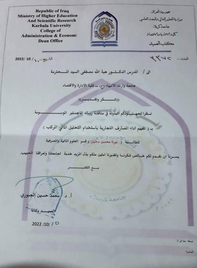 شاركت الدكتورة هبة الله مصطفى رئيس قسم المحاسبة في كلية الإدارة والاقتصاد في مناقشة رسالة الماجستير للطالبة نورة محسن دخيل لرسالتها الموسومة (تقييم اداء المصارف التجارية بإستخدام التحليل المالي المركب) وذلك في يوم الاثنين المصادف ٢٠٢٢/١٠/١٠؛ في جامعة كربلاء كلية الإدارة والاقتصاد قسم العلوم الماليه والمصرفيه.اذا تألفت لجنة المناقشة من السادة الافاضل :أ.د. علي احمد فارس… رئيساأ.م.د. محمد فائز حسن … عضوام.د. هبة الله مصطفى … عضواا.م.د. كمال كاظم جواد ..عضوا ومشرفاوبعد مناقشة مستفيضة تم منح شهادة الماجستير ..فكل التوفيق والسداد للباحثة والمشرف وللجنة المناقشه