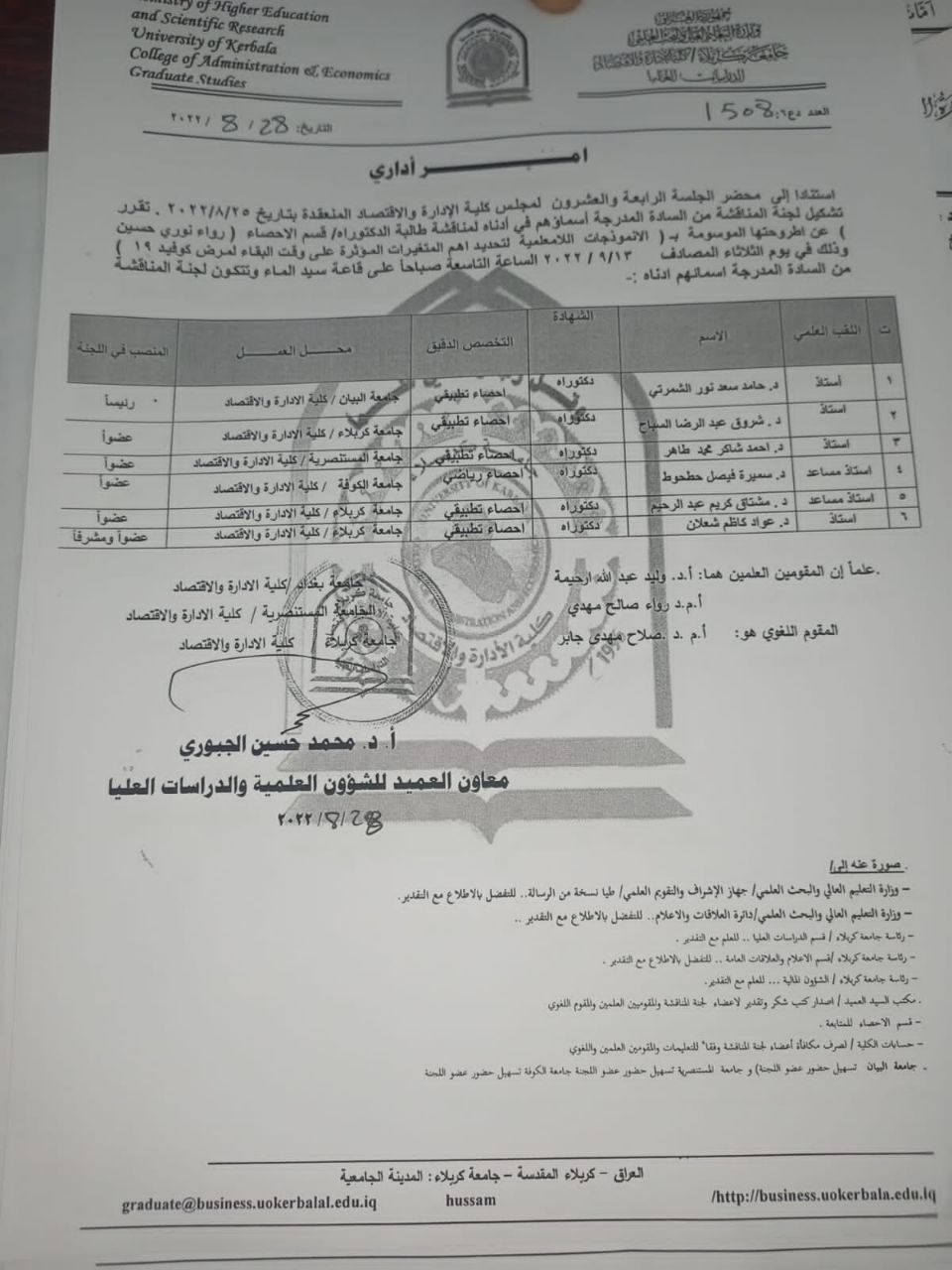أ.م.د.مشتاق كريم عبد الرحيم / عضواأ.د.عواد كاظم الخالدي / عضوا ومشرفاوبعد مناقشة مستفيضة تم منح شهادة الدكتوراة ..فكل التوفيق والسداد للباحثة والمشرف وللجنة المناقشة