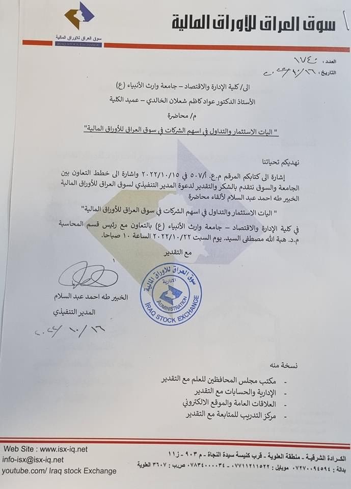 تسر عمادة كلية الادارة والاقتصاد /قسم المحاسبة ، ان تعلن عن نشاط علمي جديد يضيف الاضواء الى سماء كليتنا ،وذلك من خلال استضافه احد اعلام اسواق المال وهو (المدير التنفيذي لسوق العراق للاوراق المالية الاستاذ الخبير طه عبد السلام) وذلك في يوم السبت المصادف ٢٠٢٢/١٠/٢٢ لالقاء محاضره مشتركة مع الدكتورة هبة الله مصطفى السيد بعنوان (آليات الاستثمار والتداول في اسهم الشركات في سوق العراق للأوراق المالية) لذلك نسترعي الانتباه واهلا وسهلا بكم