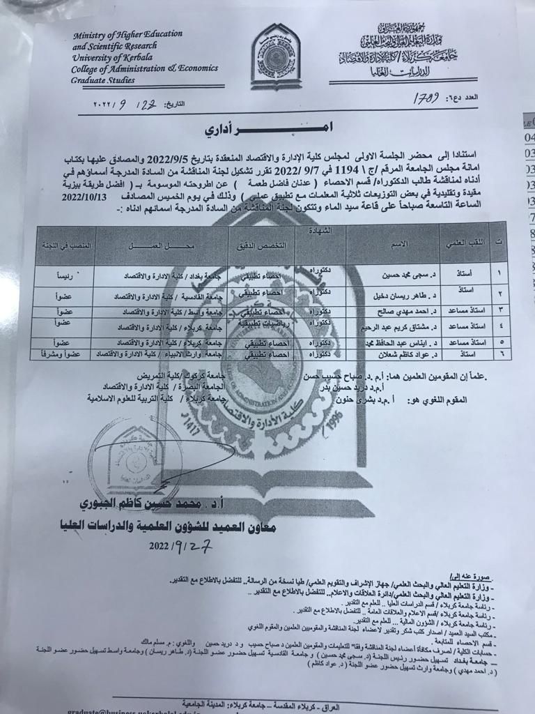 شارك الاستاذ الدكتور عواد كاظم الخالدي في عضويه ومناقشة رسالة الماجستير للطالبة (نور عامر حرب) لرسالته الموسومة (التقدير البيزي consul Kumaras في ضل دالة خسارة تربيعية ودالة خسارة انتروبي عامة دراسة تطبيقية) وذلك في يوم الخميس المصادف 10/11/2022، في جامعة كربلاء كلية الإدارة والاقتصاد قسم الاحصاء.اذا تألفت لجنة المناقشة من السادة الافاضل :أ.د.قتيبة نبيل نايف / رئيساأ.م.د.نجاح رسول داخل / عضوام د.مشتاق كريم عبد الرحيم / عضواأ.د عواد كاظم الخالدي / عضوا ومشرفاوبعد مناقشة مستفيضة تم منح شهادة الدكتوراة ..فكل التوفيق والسداد للباحث والمشرف وللجنة المناقشة