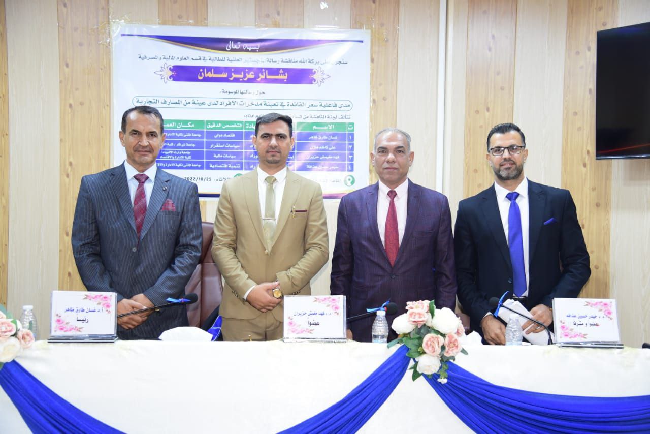 شارك الاستاذ المساعد الدكتور فهد مغيمش حزيران الشمري / معاون عميد كلية الادارة والاقتصاد/ جامعة وارث الأنبياء (عليه السلام) ، كعضو في لجنة مناقشة رسالة الماجستير الموسومة (مدى فاعلية سعر الفائدة في تعبئة مدخرات الأفراد لدى عينه من المصارف التجارية) في جامعة المثنى / كلية الادارة والاقتصاد لطالبة الدراسات العليا (بشائر عزيز سلمان) يوم الثلاثاء الموافق ٢٠٢٢/١٠/٢٥.